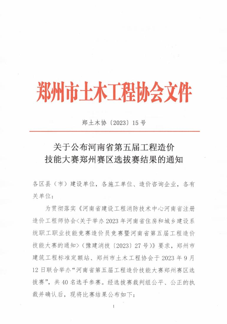 关于公布河南省第六届工程造价 技能大赛郑州赛区选拔赛结果的通知
